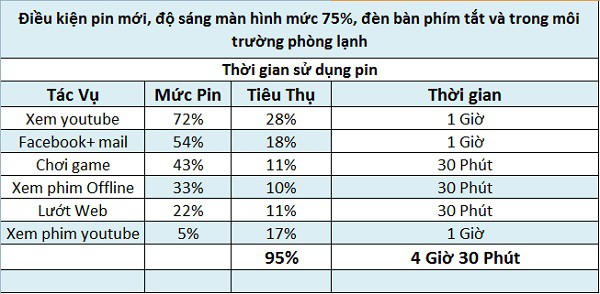 Không có cụ thể thời gian sử dụng pin chính xác nào từ hãng. Tuy nhiên với những trải nghiệm, cài đặt máy thì có một số thông tin tham khảo về pin như sau: