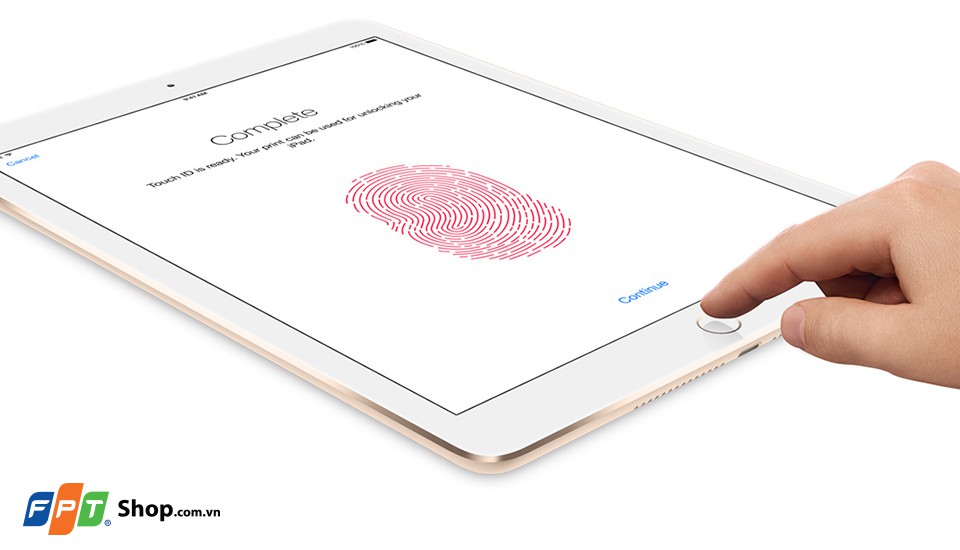 iPad Air 2 sở hữu công nghệ đột phá cảm biến vân tay Touch ID. Bạn sẽ có được độ an toàn cao nhất khi sử dụng thiết bị vì chìa khóa chính là dấu vân tay của bạn. Việc bảo mật không những an toàn mà còn nhanh chóng hơn, chỉ một lần chạm vào phím Home – bạn đã có thể mở khóa iPad Air 2. Touch ID mới trên iPad Air 2 không chỉ để mở khóa mà bạn còn dùng nó để mua hàng trên iTunes, iBooks, App Store mà không phải mất thời gian nhập mật khẩu. Hơn thế nữa, Apple Pay cho phép bạn mở cửa thế giới mua sắm online cực nhanh, thuận tiện và an toàn.