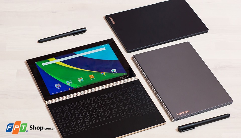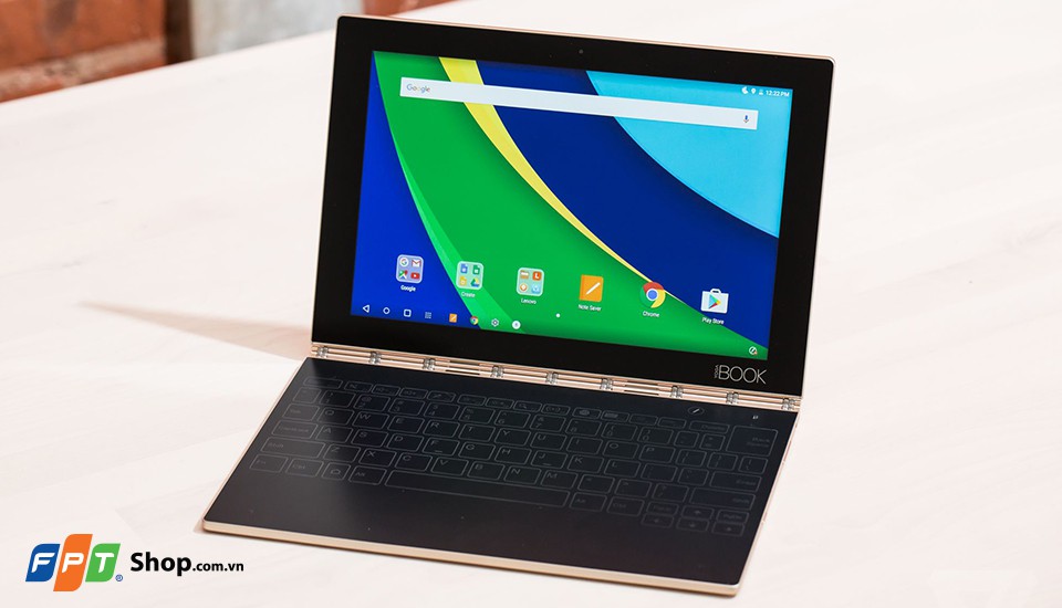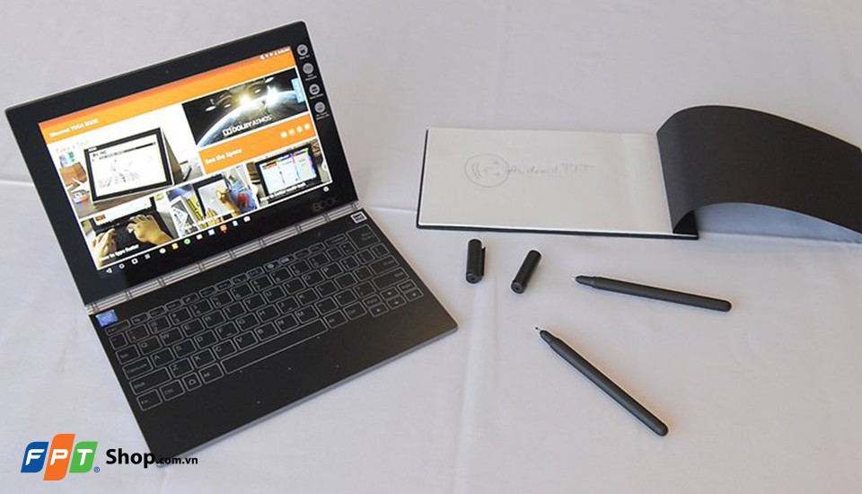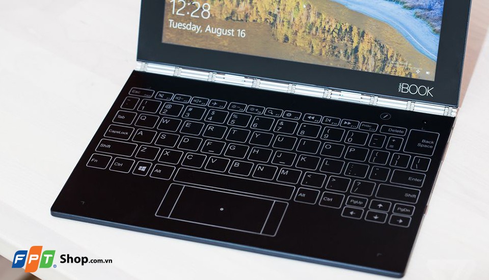 Lenovo Yoga Book là một chiếc laptop kỳ lạ, đẹp và độc đáo bởi vì nó không có bàn phím cứng. Với kích cỡ chỉ tương đương với một quyển sách bìa cứng, một nửa đúng chuẩn một chiếc tablet với màn hình cảm ứng, nửa còn lại là một bàn phím cảm ứng vô cùng đặc biệt.